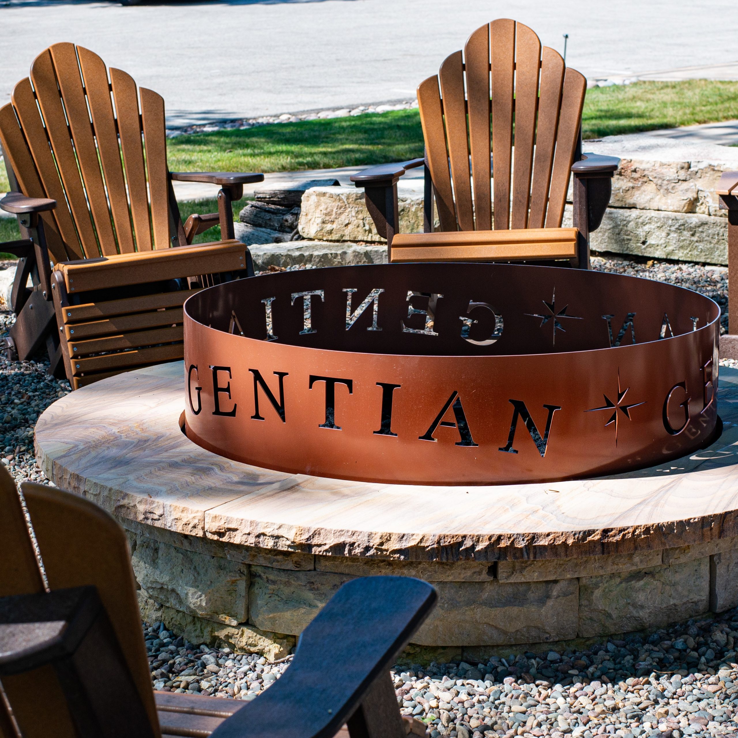 Among the outdoor gathering spaces is a raised gas and wood-burning fire pit. It is fitted with a custom-made laser cut ring, which showcases the company name and is visible at night from the road. Pillars and steps define the entrances to the large and shaded “back yard feel.”