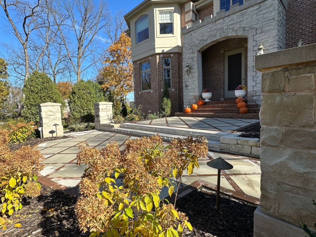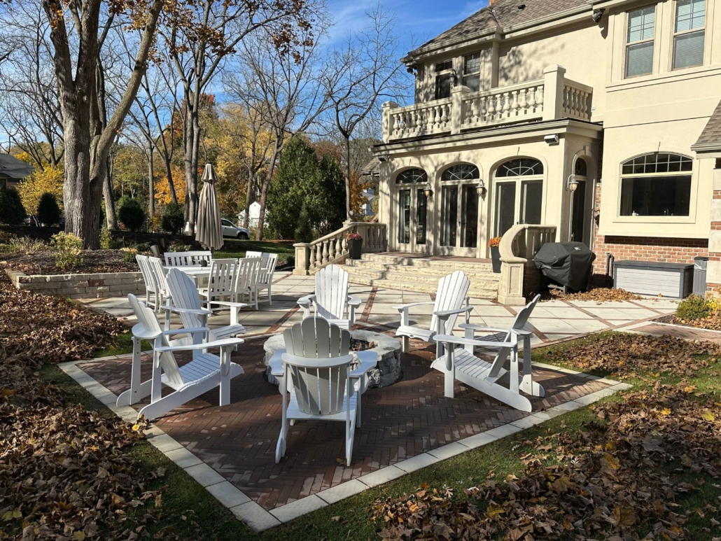 Several hardscape areas—including the front entry, back patio, and driveway inlay—were fully reconstructed with a more refined and cohesive aesthetic. Subtle patterning, including herringbone and crosshatch inlays, adds structure and visual interest, while salvaged clay pavers were repurposed as edging to bring continuity to the design. A gas fire pit was incorporated into the back patio to create a comfortable outdoor gathering space.